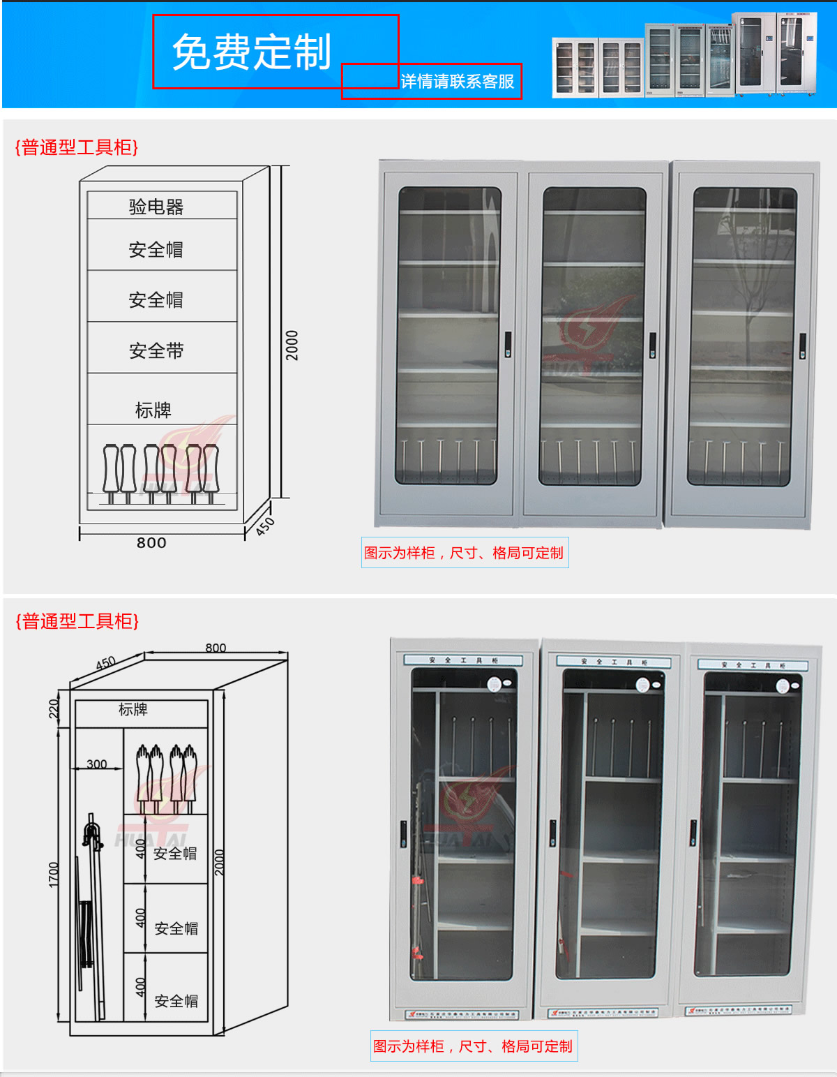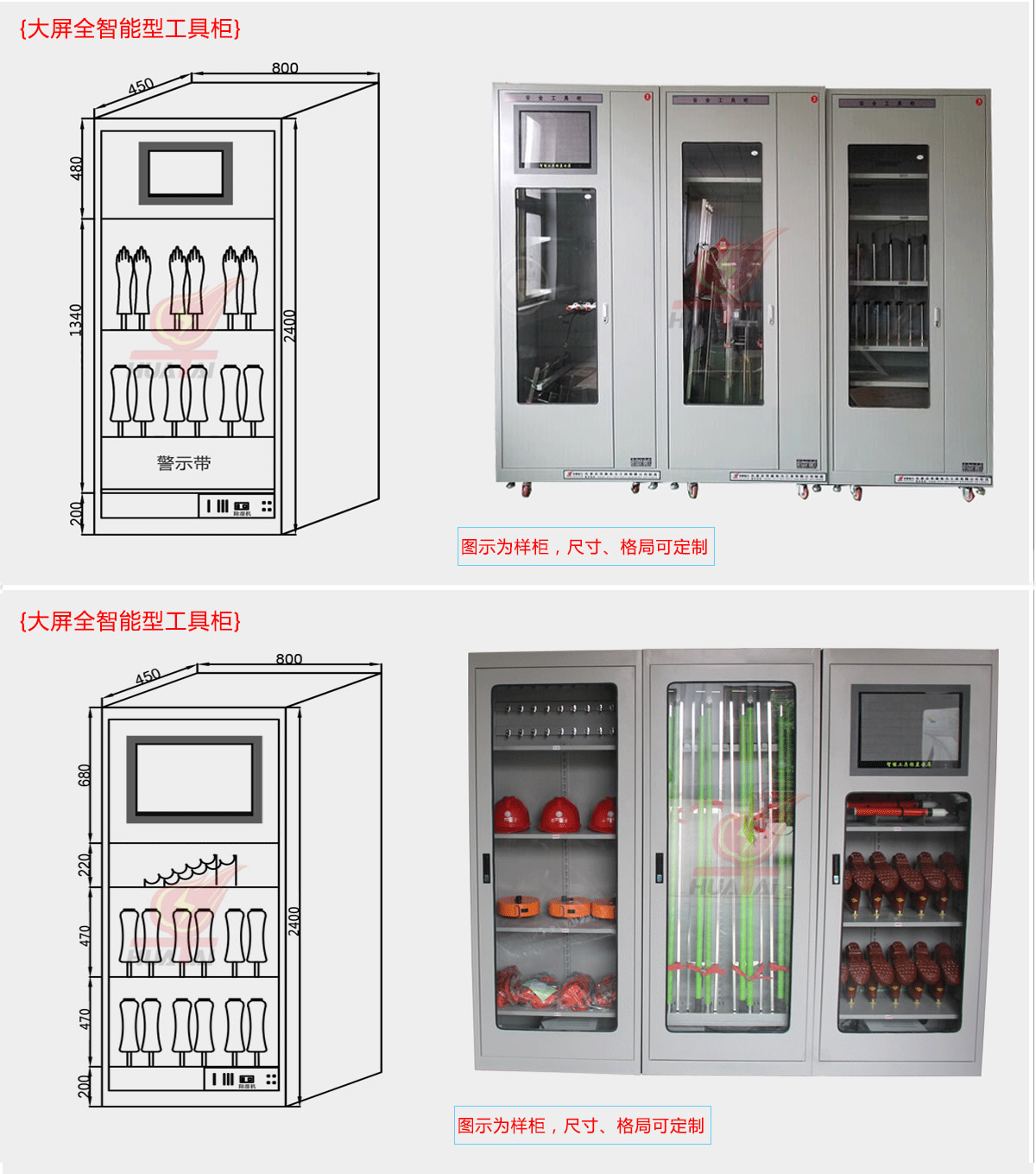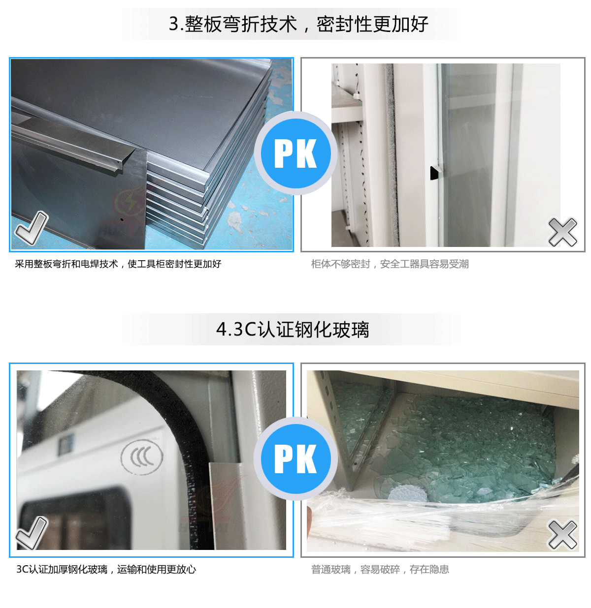 柜體材質為冷軋鋼板,鋼板厚度為1.2mm,柜體自重為75公斤,保證承重強度和站立穩定性。柜體表面為靜電防腐噴塑工藝,顏色為駝白皺,柜門裝有通體透明有機玻璃,透過玻璃門可以看到分類有序的各種工器具。