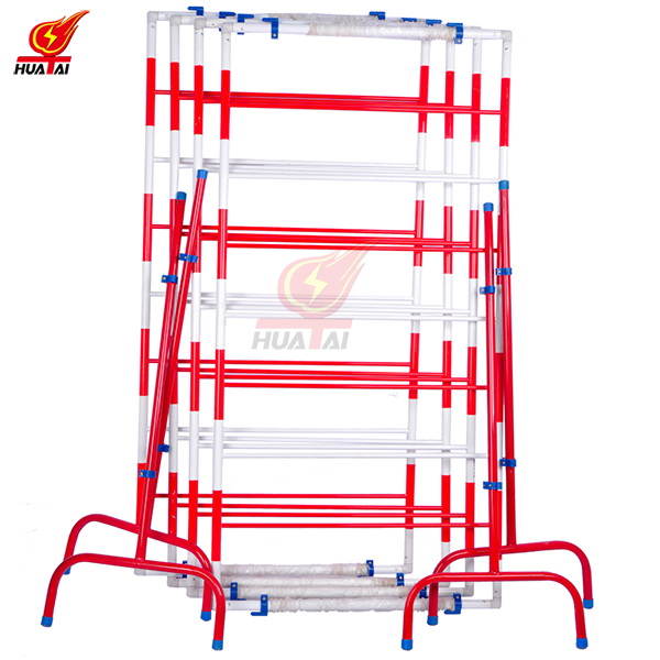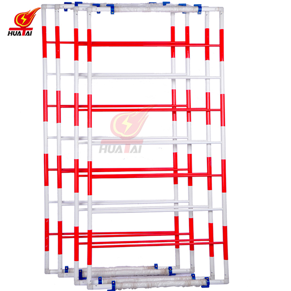 圍網為紅白相間;外形美觀;圍網的上邊沿配“止步,高壓危險”警示牌; 支撐桿采用鐵桿、不銹鋼、環氧樹脂等材料制成, 上面設有掛鉤或夾子, 可以牢固張掛聚酯網, 使之不易被掀起脫離; 底座有鑄鐵和收縮式鐵叉等,可供用戶選擇搭配使用.