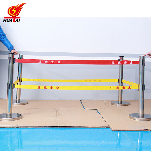 帶子長(zhǎng)度3——5米,帶寬5cm。下面是鑄鐵的鐵墩外面帶一層不銹鋼罩,可以雙層也可以單層,一般是上紅下黃,可以根據(jù)客戶要求任意logo定做。每根立柱上都含有帶子,四個(gè)方向都可以掛帶子。