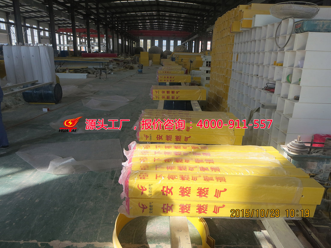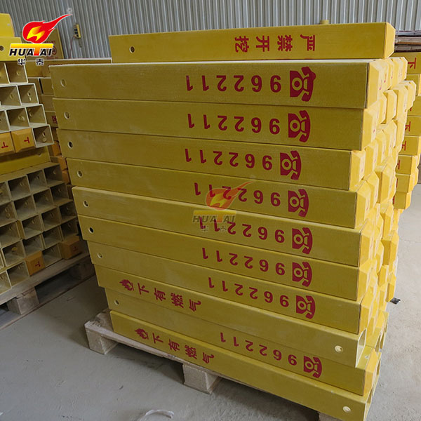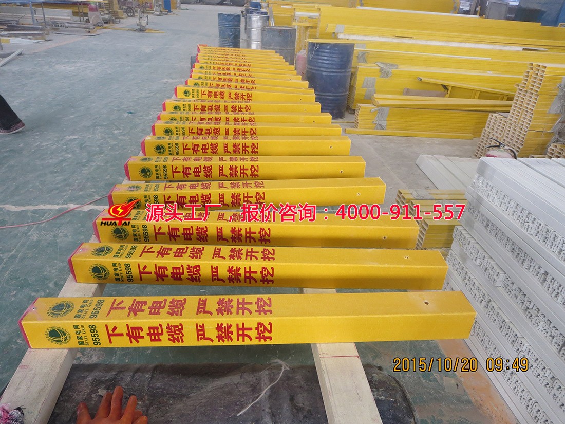 玻璃鋼標志樁是FRP拉擠型材,其采用玻璃纖維及其制品作為增強材料,鈣粉為填充劑,以合成樹脂作基體材料通過玻璃鋼拉擠機一次性拉擠成型。經高溫壓制而成。抗沖擊,耐磨損,耐高溫,耐腐蝕,可以抗水、汽油、酒精、電解鹽、醋酸、鹽酸、鈉鉀化合物、尿、瀝青,適合各種酸堿土壤。使用壽命長達30年。內容采用絲網印刷技術,警示效果好,不需要維護。重量輕,便于運輸安裝。無回收價值,自然防盜。